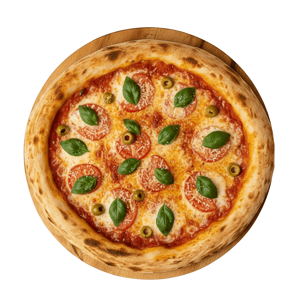 Escolha ideal para quem busca uma pizza saborosa e autêntica com massa levemente crocante, molho de tomates, tomates em rodelas, muçarela, parmesão, folhas de manjericão, que proporcionam um toque de sabor e aroma especiais, azeitonas e orégano.