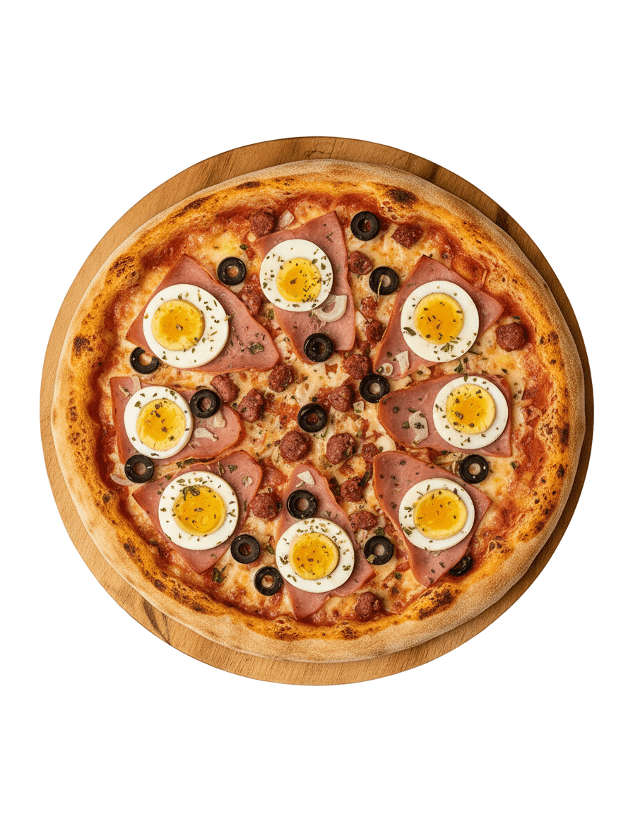 Como queridinha dos brasileiros, este sabor não poderia ser menos elaborado, com massa levemente crocante, molho de tomates, muçarela, presunto, ovos cozidos, ervilhas, rodelas de cebola, azeitonas e todo o aroma do orégano.